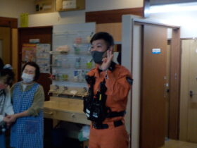 米沢消防署の隊員の方のお話があり、「もし本当の火災が起きても職員さんの指示に従って冷静に避難してください」